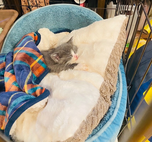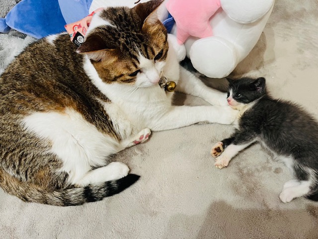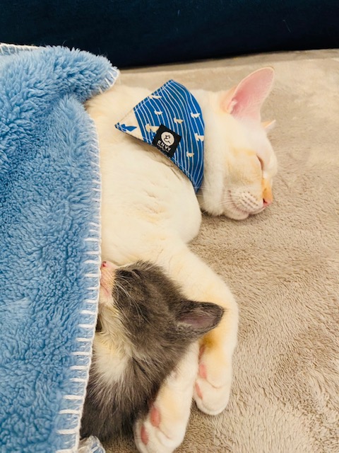 ご家族皆様の手厚い看病により見事回復したムーンちゃん、先住猫ちゃんも受け入れてくれて添い寝をしてくれているそうです。